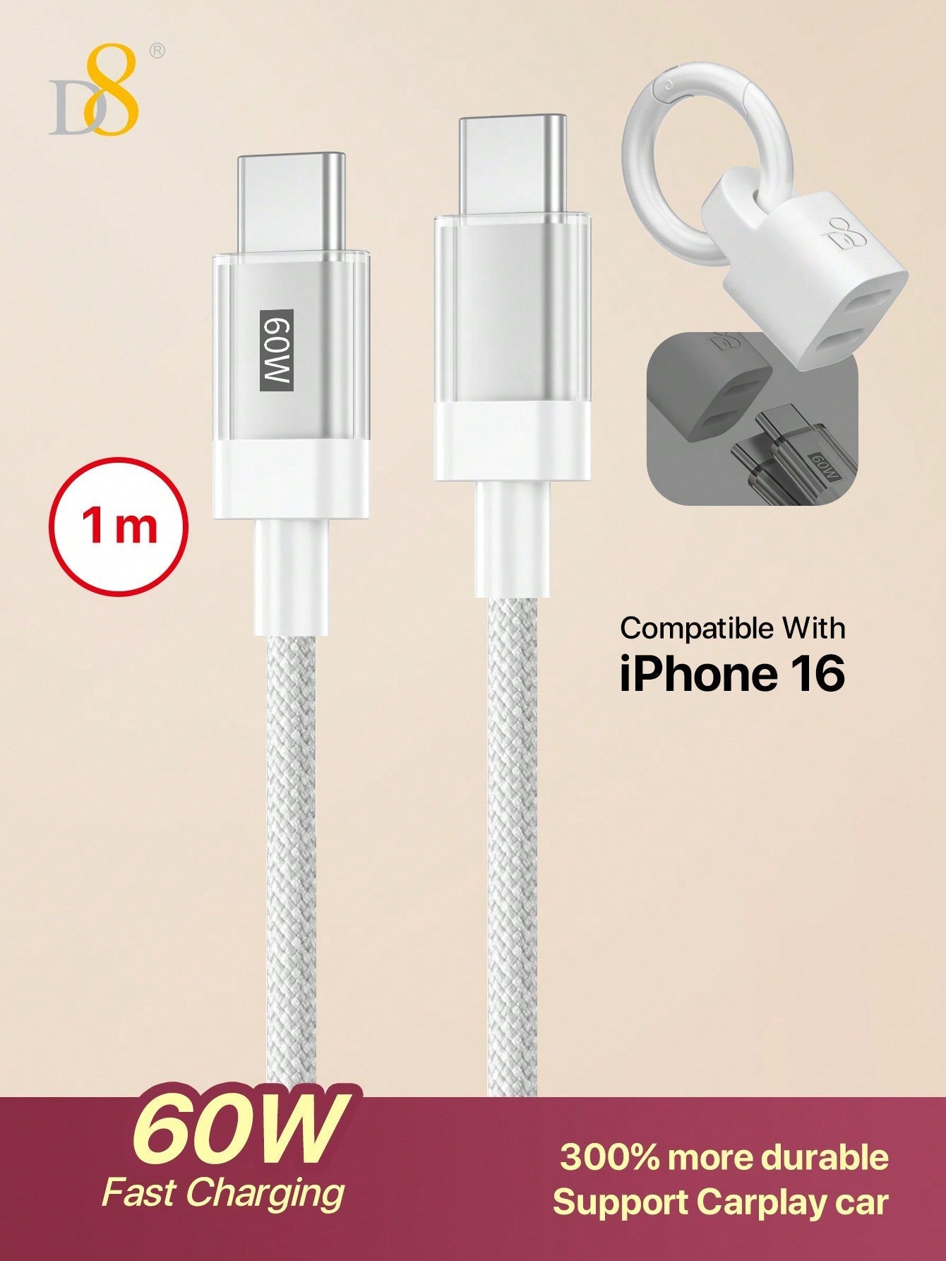 D8 USB-C 고속충전 케이블 (키체인 포함) 60W PD 지원 / 나일론 브레이드 / 실용적인 키링 디자인