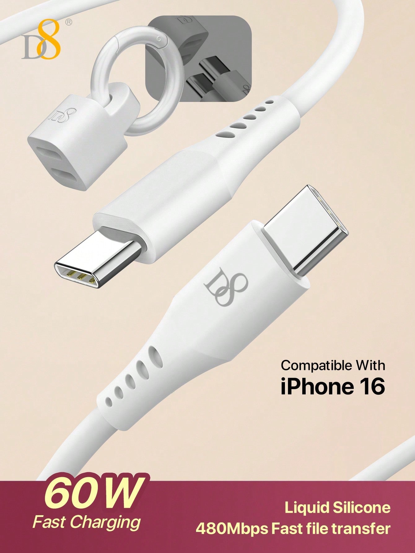 D8 USB-C 키체인 충전 & 데이터 케이블 (1.2M) 60W 고속 충전 | 데이터 전송 | 휴대용 키링 디자인 | 전기종 USB-C 호환