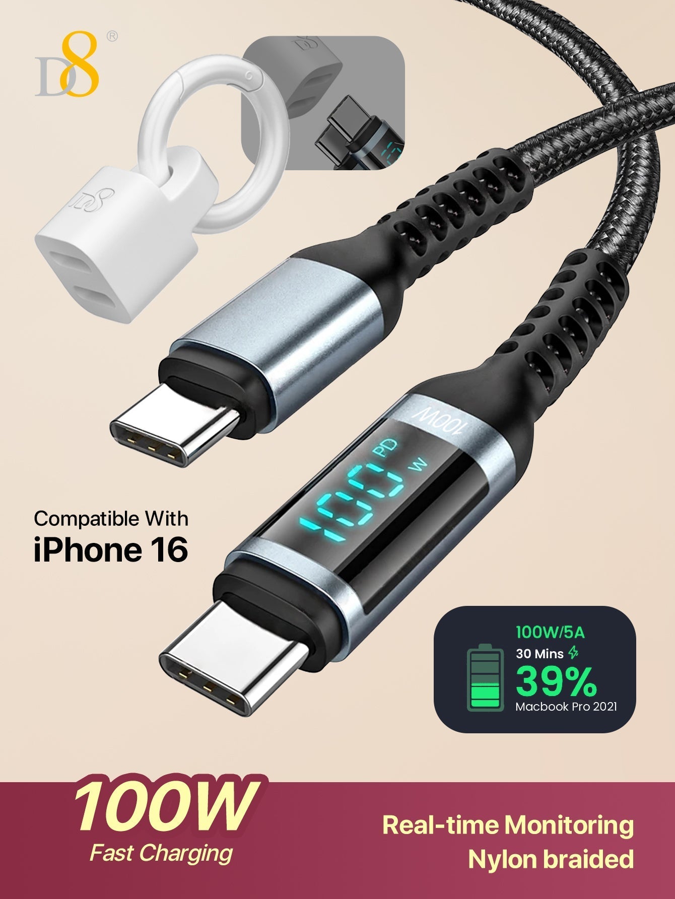 D8 USB-C 고속 충전 케이블 1.2m | 최대 100W / 5A 고속충전 | LED 전력 디스플레이 | 나일론 편조 | iPhone & Samsung 호환