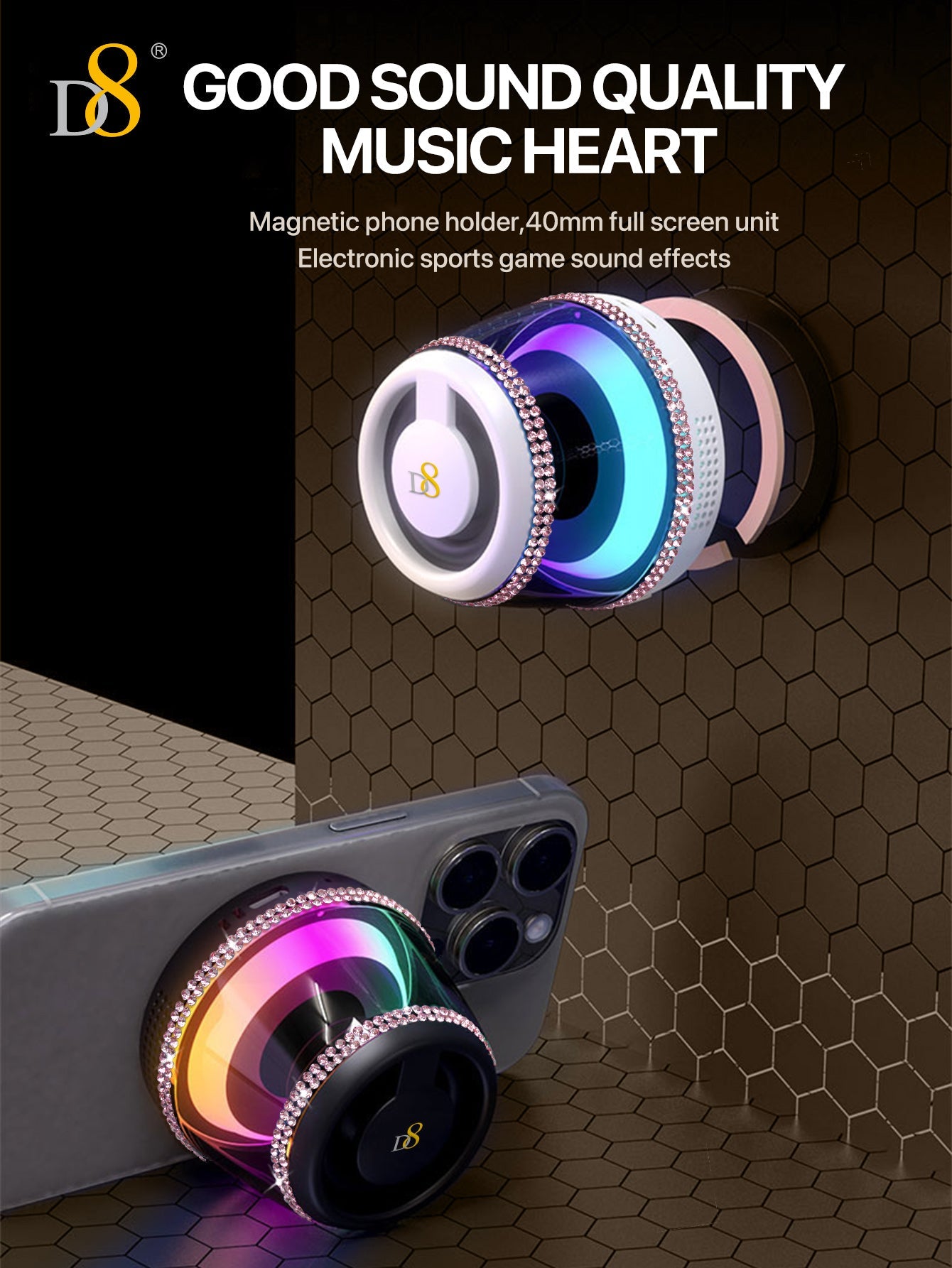 D8 무선 유도 자석 블루투스 스피커 5W 중저음 | 10시간 재생 | RGB 무드등 | 자석링+스트랩 포함 | 실리콘 폴딩 에어 구조 | 초소형 휴대용 디자인