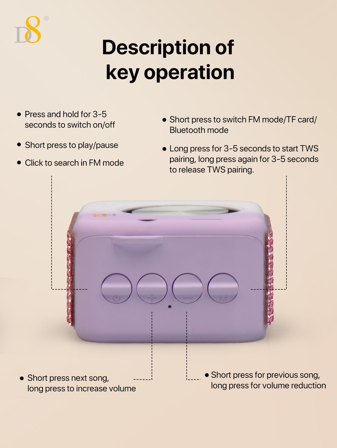 D8 포터블 블루투스 스피커는 작지만 강력한 5W 사운드, 10시간 재생, 그리고 무선 스테레오 페어링 기능까지 탑재된 다재다능한 블루투스 스피커입니다.