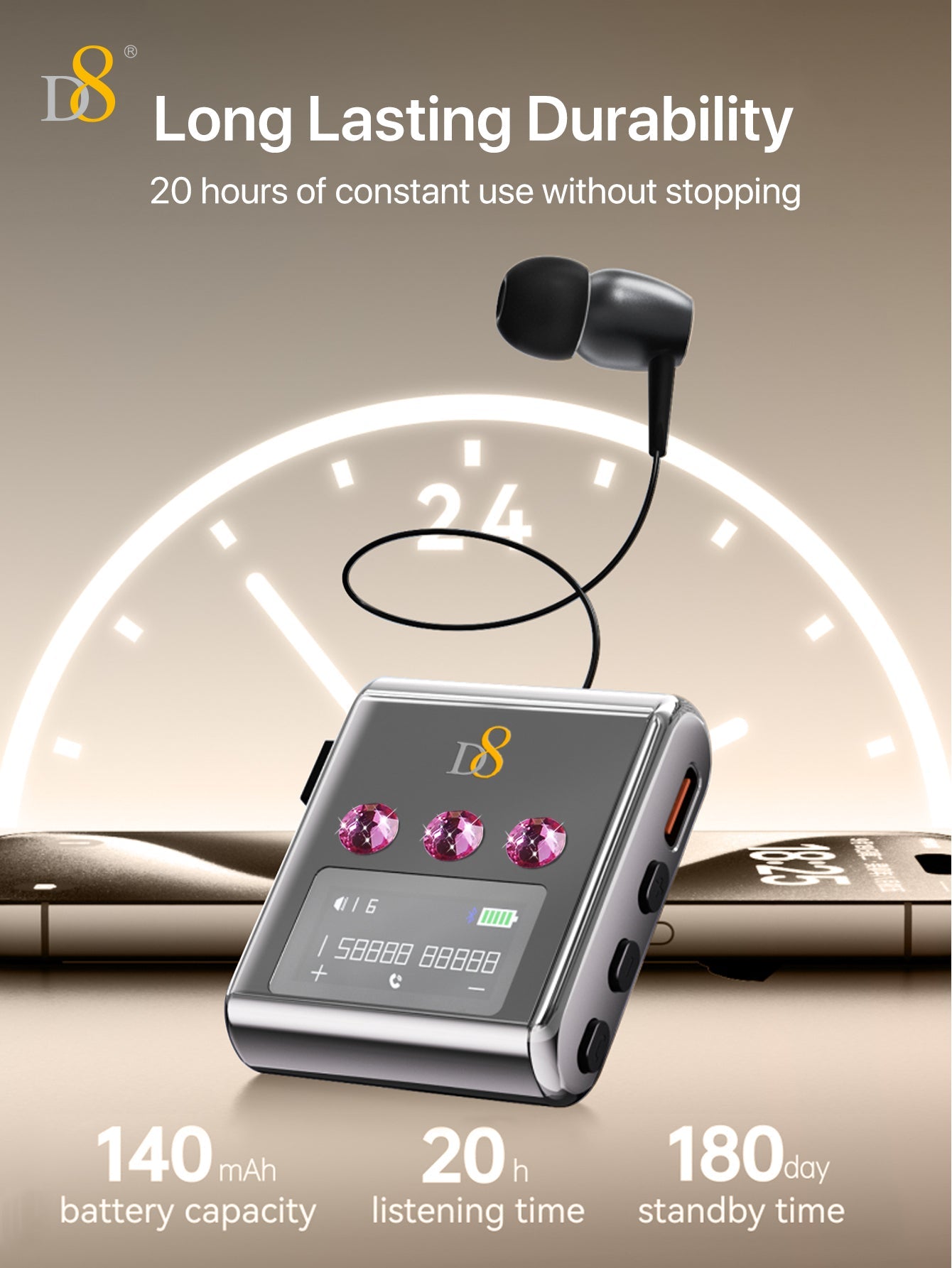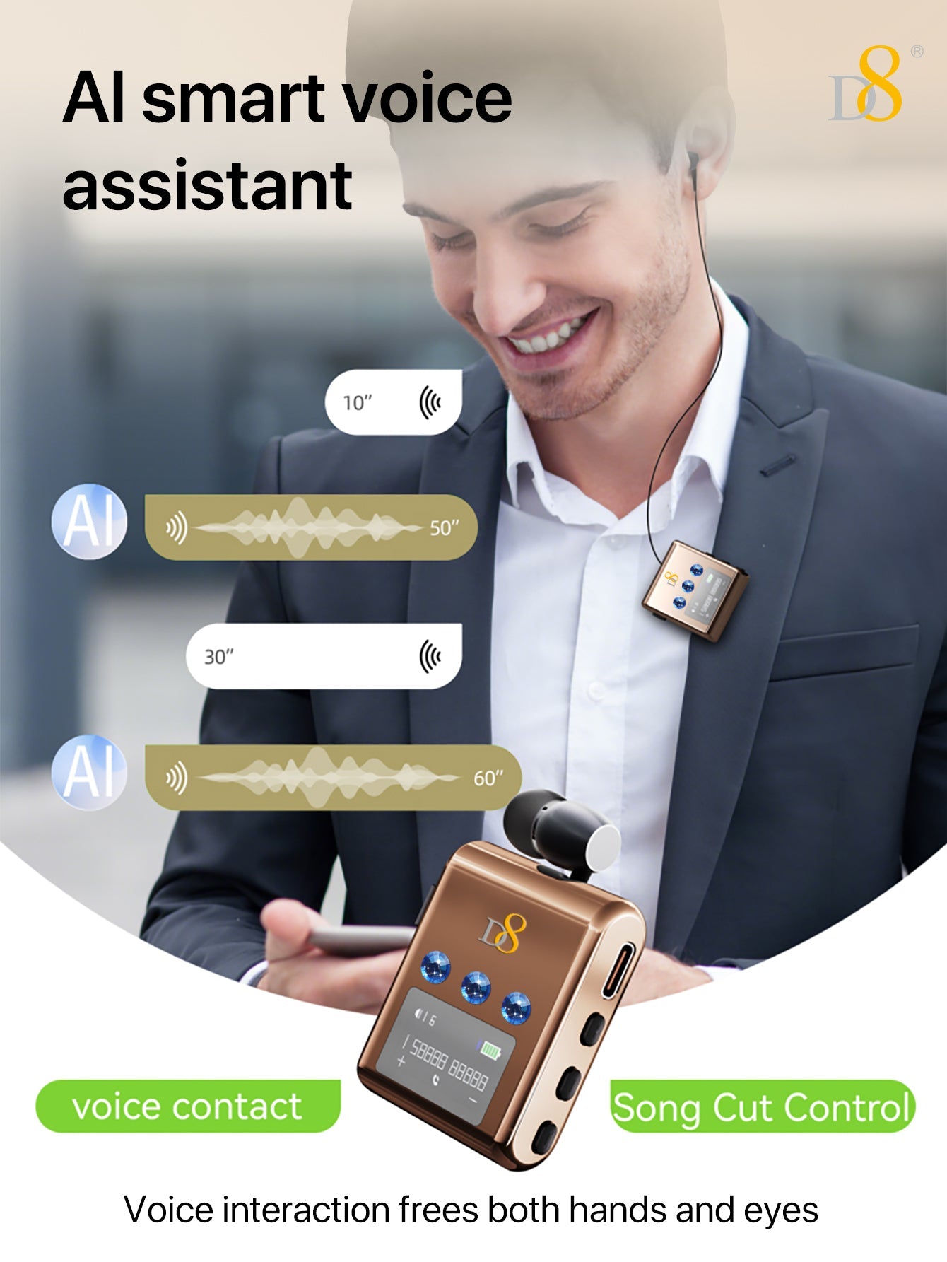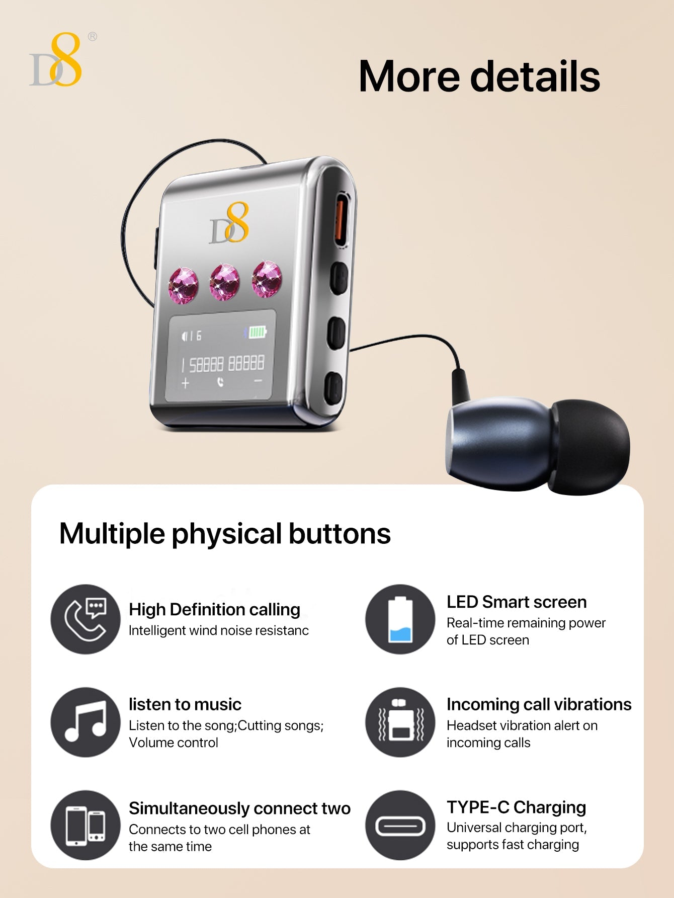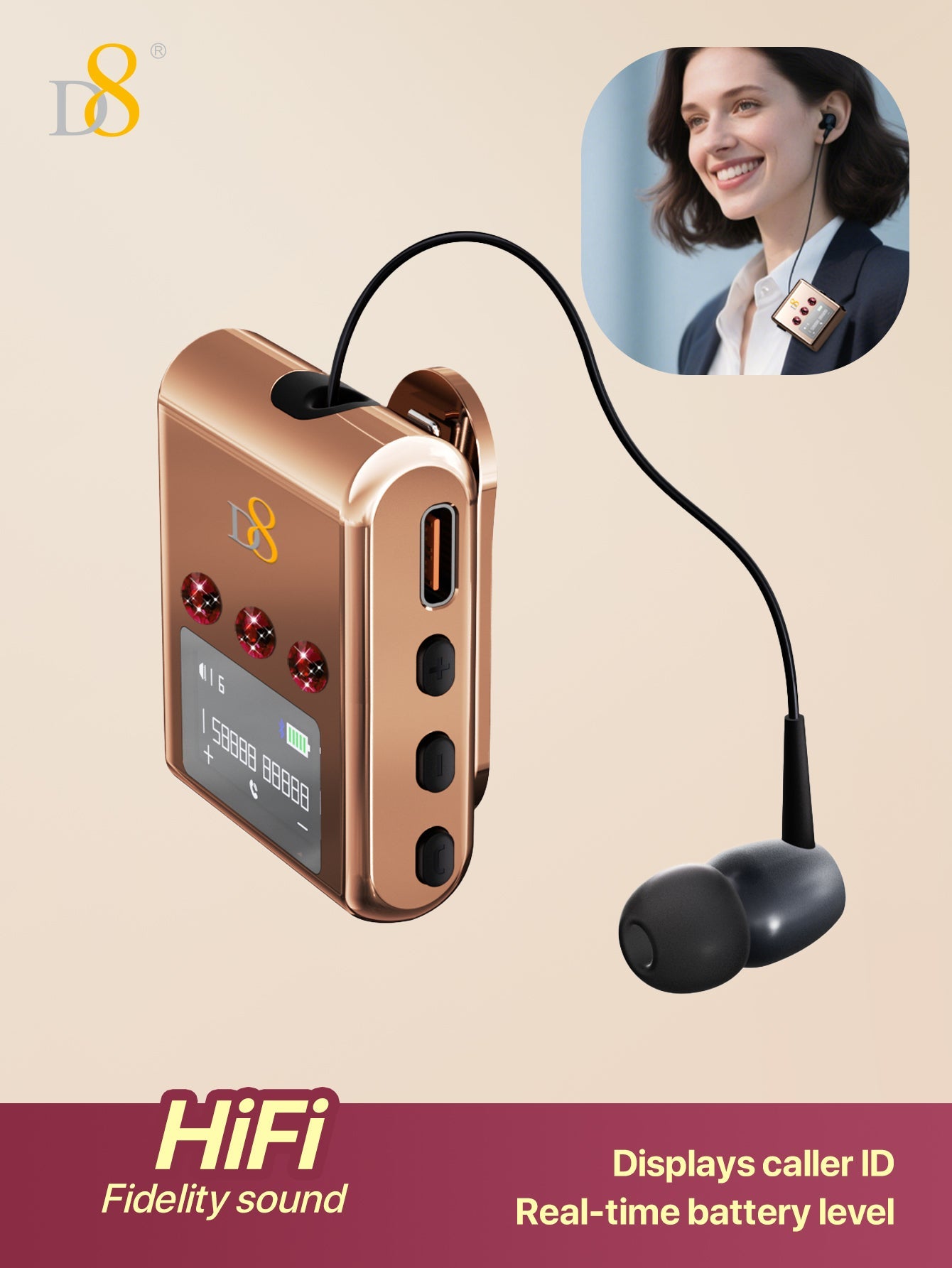 D8 리트랙터블 무선 헤드셋 LED 디스플레이 | 노이즈 캔슬링 마이크 | 20시간 통화 | 클립형 이어폰 | 스포츠 & 비즈니스용